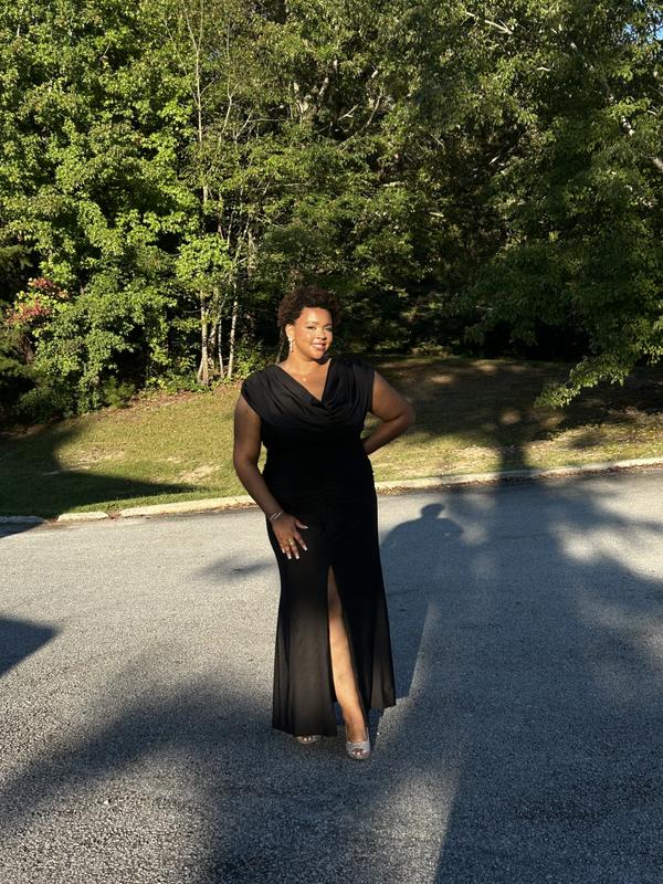 The dress is very pretty and elegant for any after 5 event. I am 5 foot five and 170 pounds. I chose the 14W. It’s very fitted and flattering. I am not very hippie but have a bit of a stomach. The pleated front camouflages well around the waist. It’s not as long as I would’ve thought, but to the floor on me. I think it’ll be a perfect dress for my class reunion banquet.
