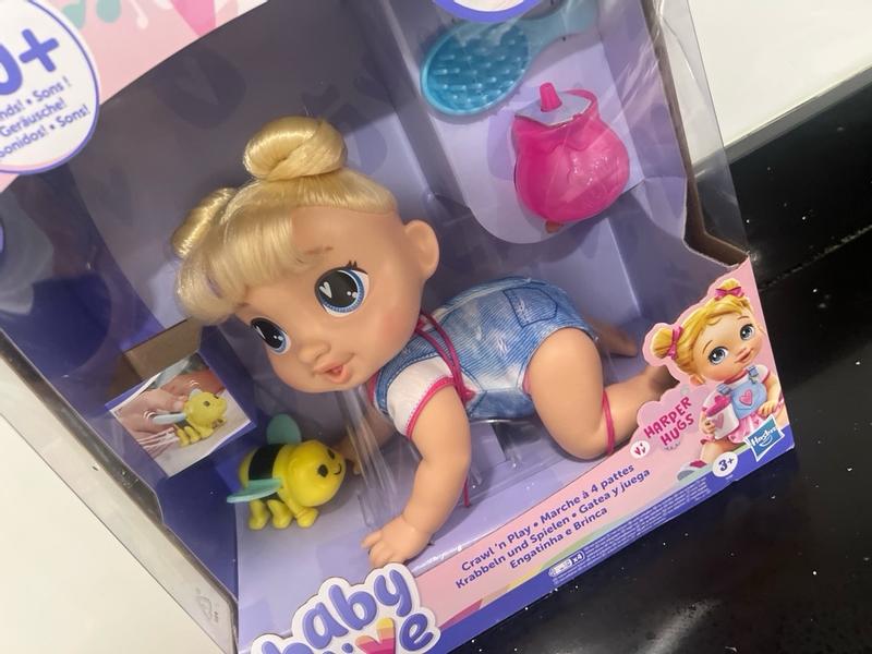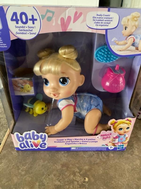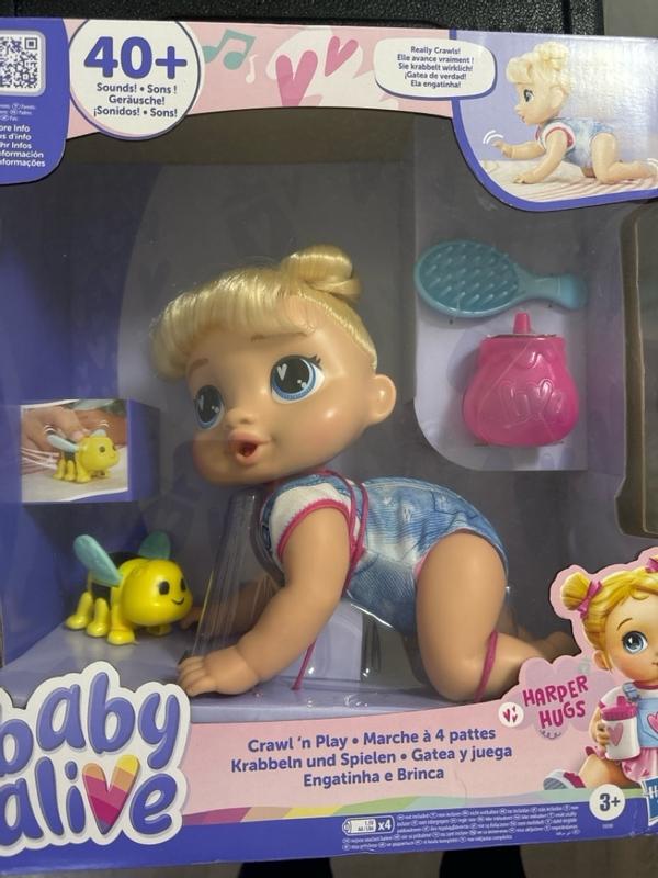 • I'M HARPER HUGS AND I REALLY CRAWL: Imagine adventures right in the living room with this 10.75-inch (27 cm) crawling baby doll playset. Press the button on her back to get her moving