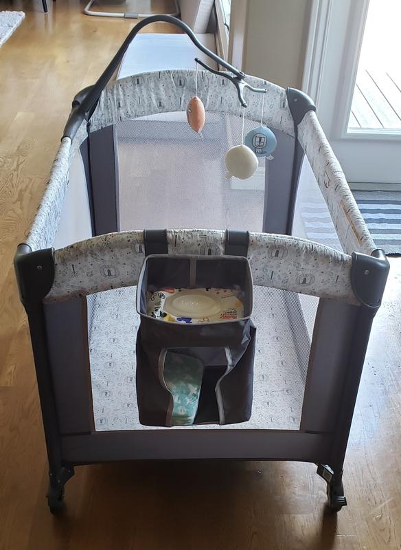 In unboxing this was very easy to assemble and set up. So simple that I didn't even need instructions. I love the height of the bassinet portion it makes it easy to set baby down and pick up. I also use the bassinet portion to change the baby so having the diaper and wipe hanger attached to the side is a great added benefit. A super plus is that the bassinet cushion moves down to the bottom so we can use this as a play pen or even a sleeper for my older son. I love the neutral colors making it great for any gender. The mobile is such an added plus for both of my kids. They love to play and reach for it. I love the fact that this has wheels making it easy to move from room to room or even for travel.