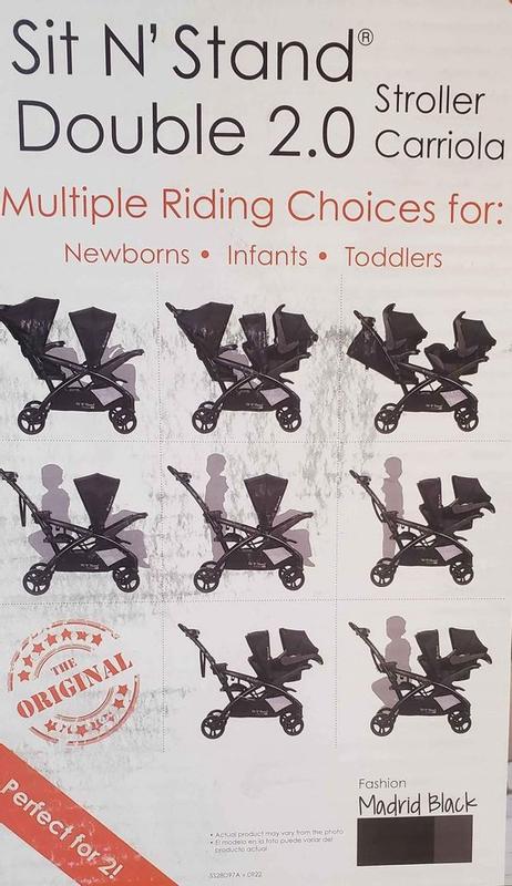 Streamlined, single front wheels allow for an easy push and a more compact footprint for the new Sit N' Stand Double 2.0. Your two will stroll in quality, comfort and style with this redesigned favorite of growing families. The Sit 'N Stand combines maximum comfort and safety with sleek style and will make your trip to the park easy and enjoyable. Both seats have a 5-point safety harness for maximum security.The front seat has a removable 2 panel fully ratcheting canopy and the rear seat has a fixed canopy with visors to block the sun. This Stroller also includes a hassle free one-hand fold, an extra-large basket for all your travel necessities and a parent console with two cup holders and a covered compartment.
