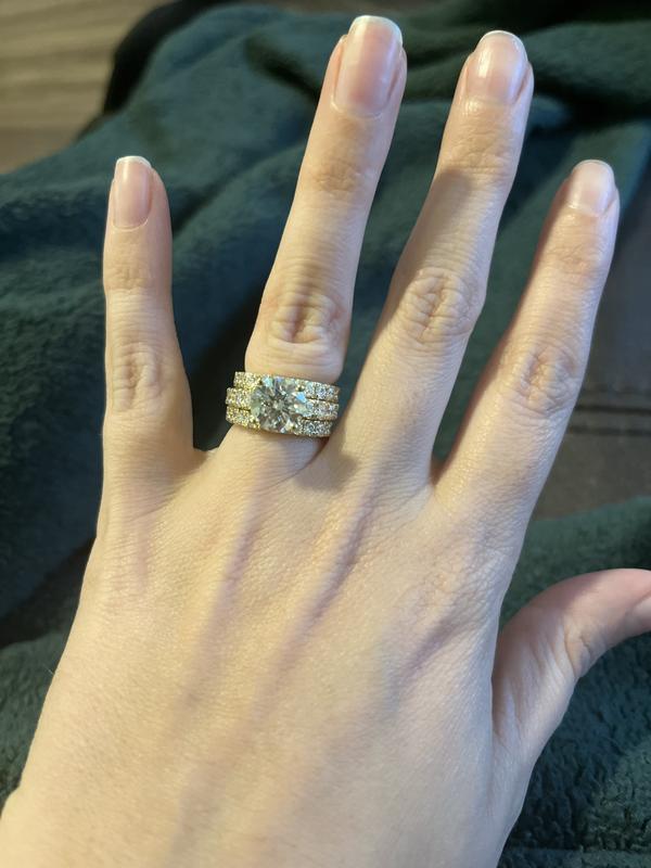 Beautiful rings. Took to Gemologist for appraisal. Matched specs for the most part, slightly lighter TW at estimated 4.7 Got at 50% sale price and the rings appraised considerably higher. Extremely great value for sale price considering gold cost of 3 rings alone and the rings couldn’t be prettier! Very happy! Came in a few weeks.