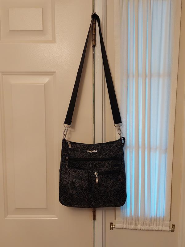 I purchased this to replace my well worn baggallini cross body purse and I love it. I chose the navy color, it is beautiful. Lots of pockets and zippers to organize my things. Thank you for my functional yet pretty bags.
