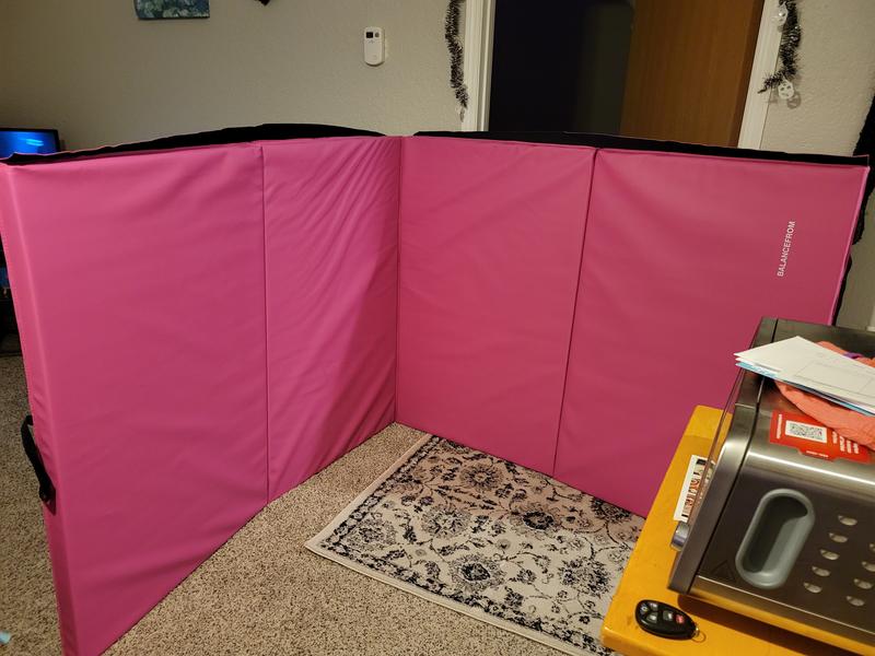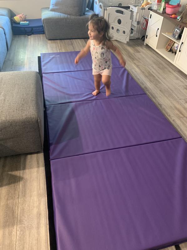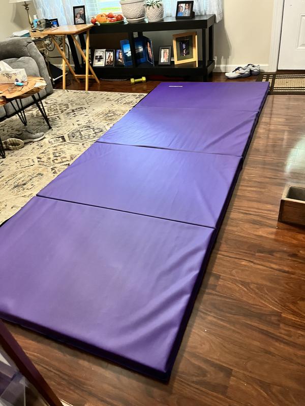 This Balancefrom folding gymnastics mat is the perfect addition to our den for my daughter who is gymnastics. It helps her practice safely at home with her stretches and tumbling. It folds up well and is easy to carry with the attached handles. It is also a great thickness which provides great protection from the floor.