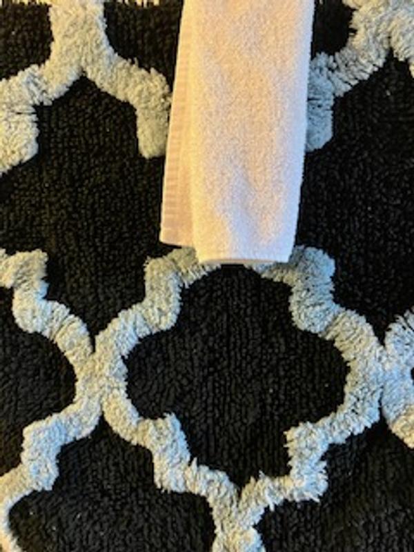 I have a black and white bathroom and was excited to fine a black and white rug which would contract nicely with my mainly white floor. The rug was on the floor about 3 days with I noticed that some of the white section was turning a grayish blue. Initially I thought it was dirt from the bottoms of out feet. I washed the rug on a cold hand wash cycle. The entire white part is now a dingy teal color. I took a picture of the rug juxtaposed with a bright white hand towel.