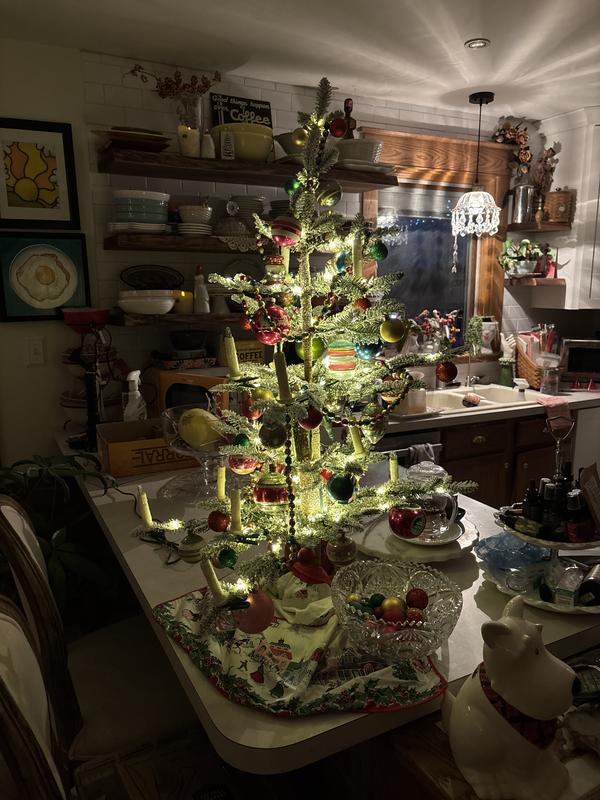 Exactly what I was looking for to place some antique ornaments! Used an antique apron as a tree skirt! And my kitchen looks charming! And yes it sparks joy every morning