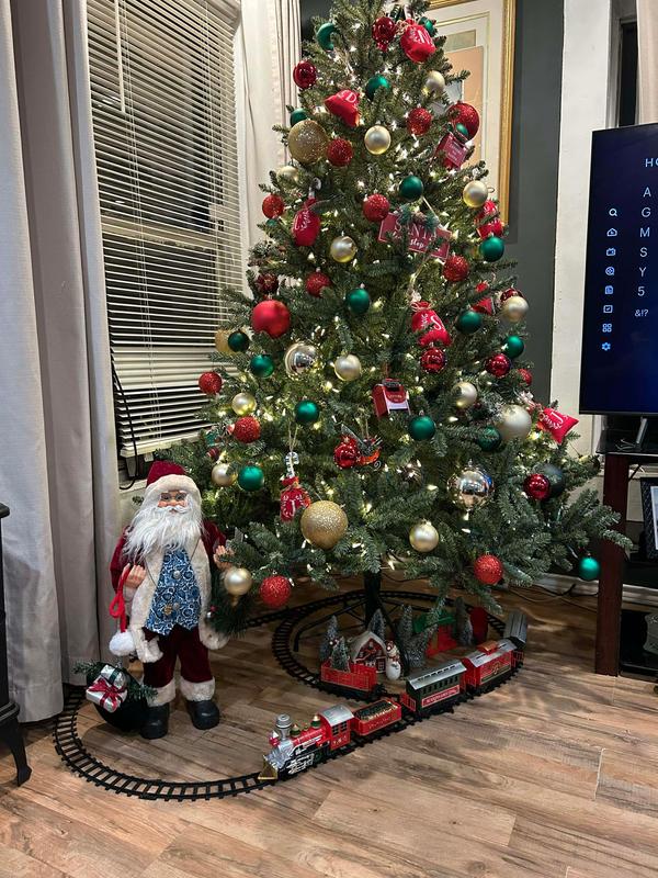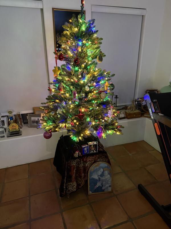 A cute little tree at 4.5 ft! Fluffs up nicely, easy to set up. I didn’t use the gloves in set up and regret it since my hands got a bit scratched up. Use the gloves! It doesn’t look real real in person but it looks great.
