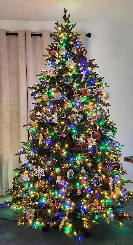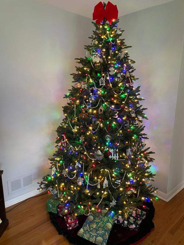 Purchased after Christmas. Love the color lights feature that has blue, green, red, yellow and white! The dimmer feature is amazing. Tree needle color and branch color variation is perfect. Easy to assemble and disassemble. So excited to decorate it for the Christmas season.