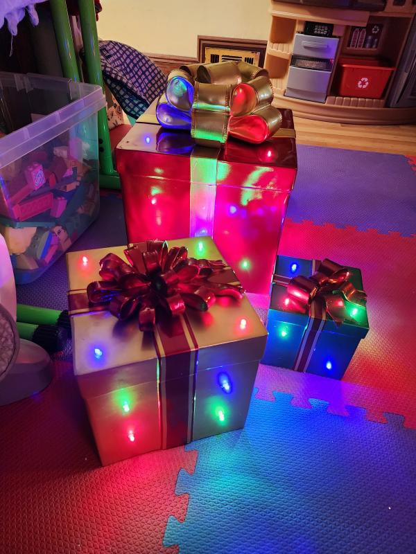 After having this set on my porch for about a week, we had a shower during the night. The following evening the smallest "gift" would not turn on. The battery compartment was wet, so we removed the batteries and let the compartment dry out for about 48 hours. Put 3 new batteries in and the little "gift" still won't come on. This outdoor decoration is not weatherproof.