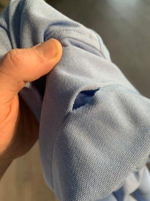 There was a hole in the seam on the sleeve. I reached out to Macy's via email, and to date I have not heard back. It was super frustrating because I specifically ordered the shirt for an event, so I had to wear it with the hole.