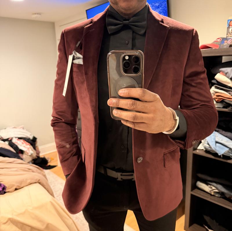 Looks bespoke on me in slim fit. Although a polyester velvet and not a cotton velvet, the fabric is very nice. Time will tell if it breathes. The color is fantastic in antique rose. Beautiful jacket overall.