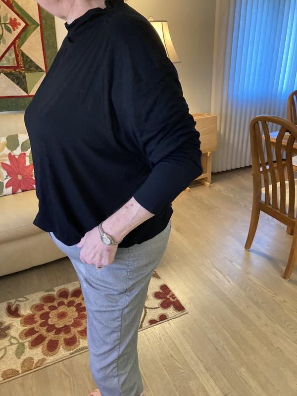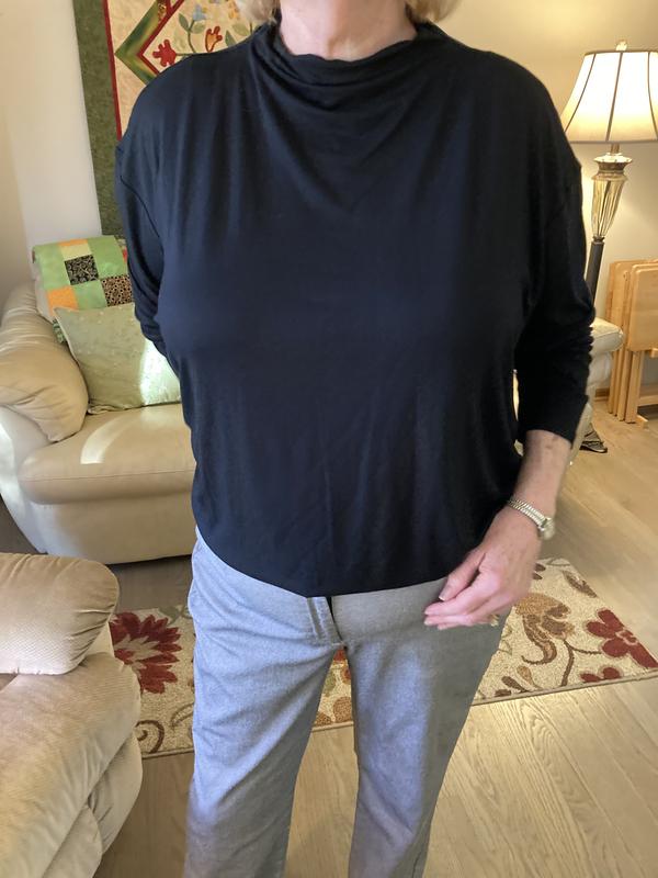 Love the bright red color and the fabric is soft and flowy! The cinched waist is flattering as is the drop raglan sleeve. The neck is like a small cowl that is more comfortable and dressy than a turtleneck.