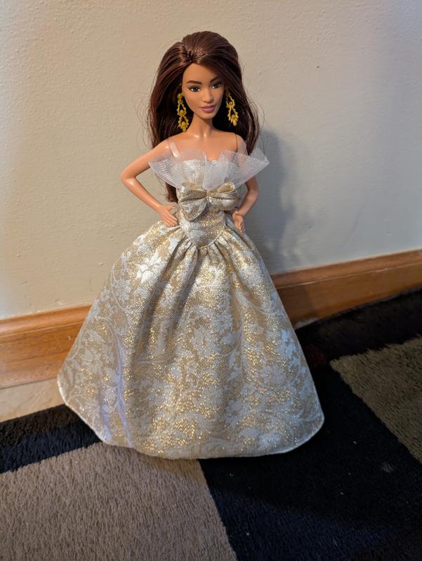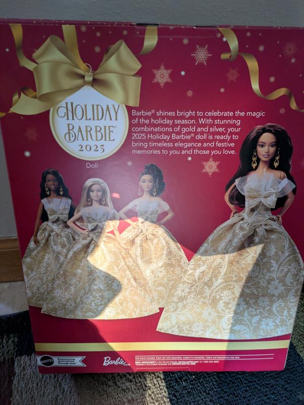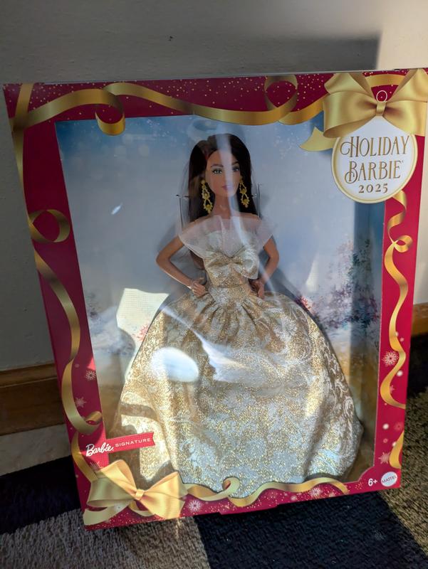 The 2025 Holiday Barbie is absolutely beautiful. Her gold gown and matching shoes sparkle perfectly, and her dark brown hair, warm brown eyes, simple makeup, and stunning earrings make her elegant and timeless. The included display stand and 2025 collection certificate add a special touch. My 6-year-old has loved adding her to her Barbie world—hosting holiday parties, dressing up friends, and creating endless imaginative stories!