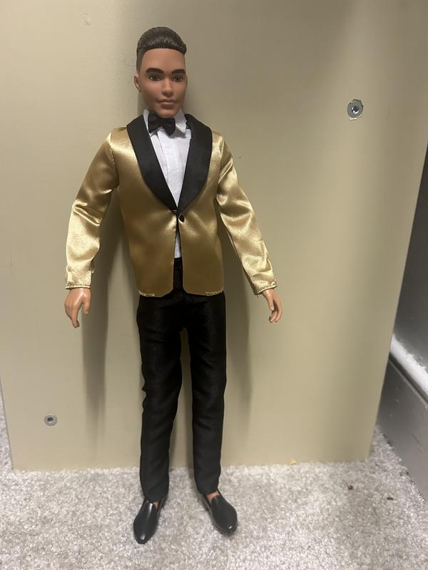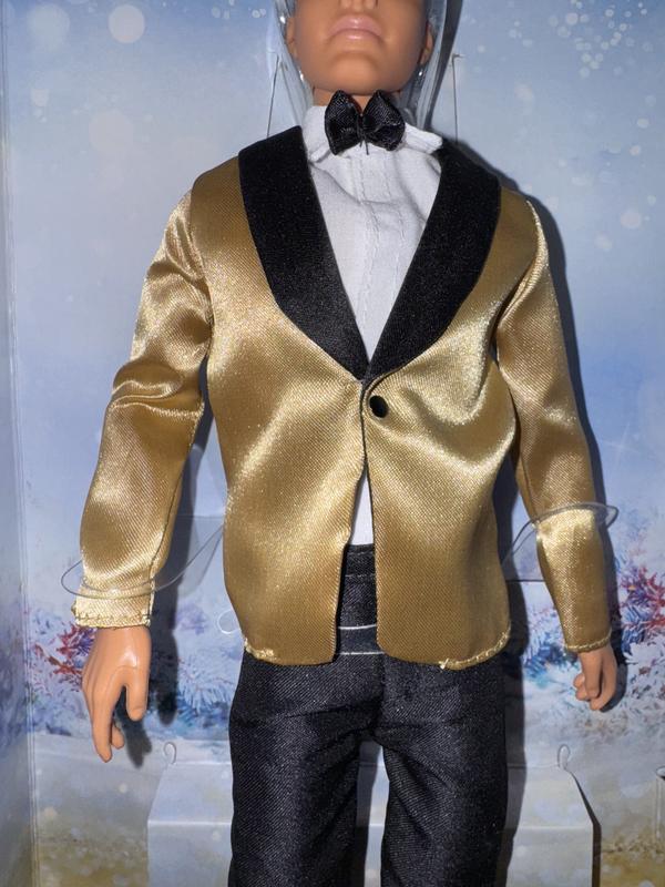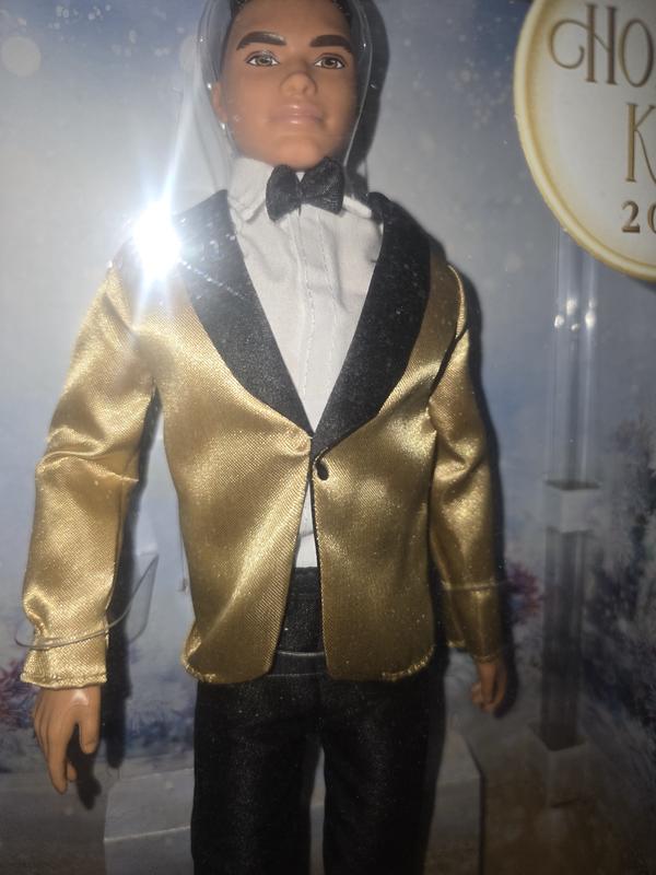 The holiday Ken Doll is a beautifully made doll. The black pants With the golden silky jacket and black bow, makes it look super elegant like he is going to a Christmas ball. The shoes are big And stylish goes great with this Ken Doll. This doll Also comes with a stand and a certificate of authenticity That sits well with Any collectors. This doll is also great for play with his silky materials It’s easy for him to slide. His hands and legs are movable, which is great for play. My daughter really enjoys it.