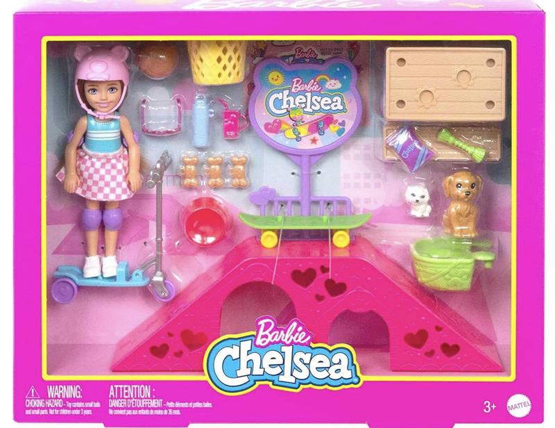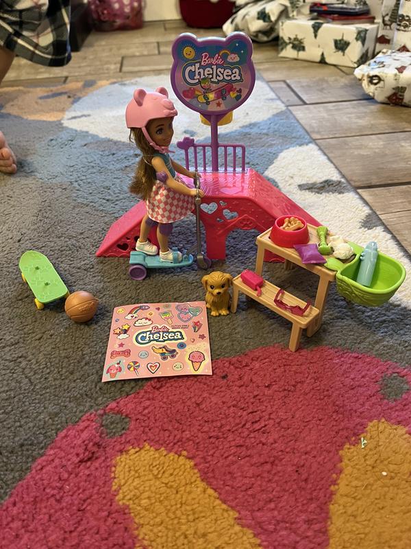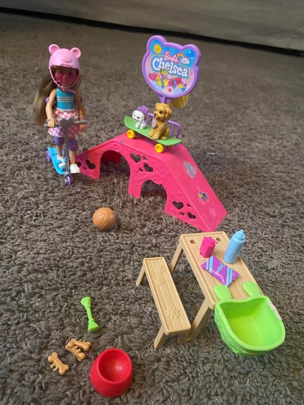 My daughter has been absolutely loving this little playset. It comes with a scooter and skateboard as well as a basket ball hoop and basket ball. The dogs are cute and fit on the various accessories. She's really enjoying the whole skatepark set. The small accessories for the Chelsea doll (helmet in the shape of an animal) and knee pads etc are great attention to detail.