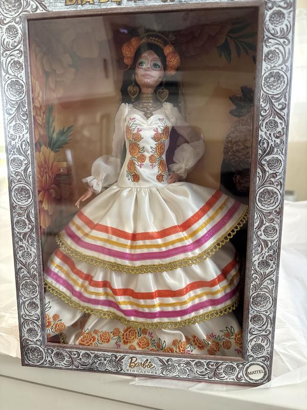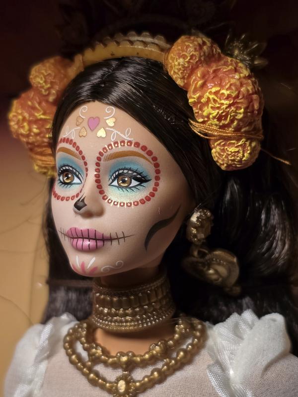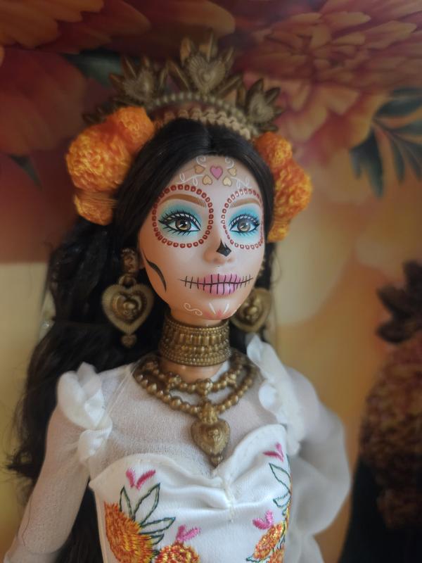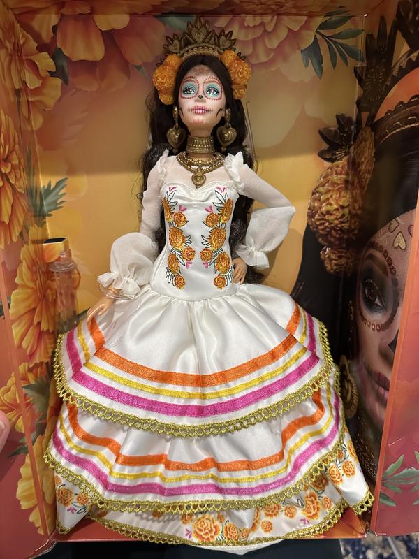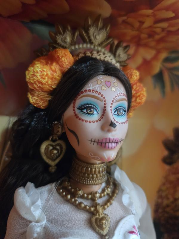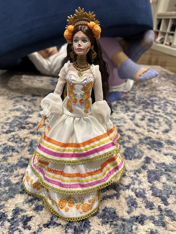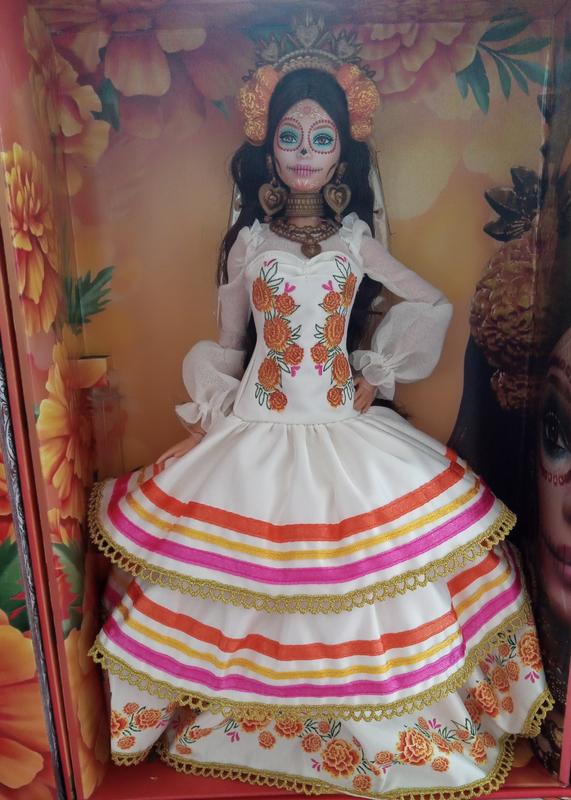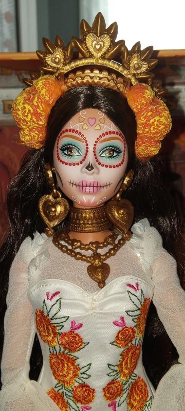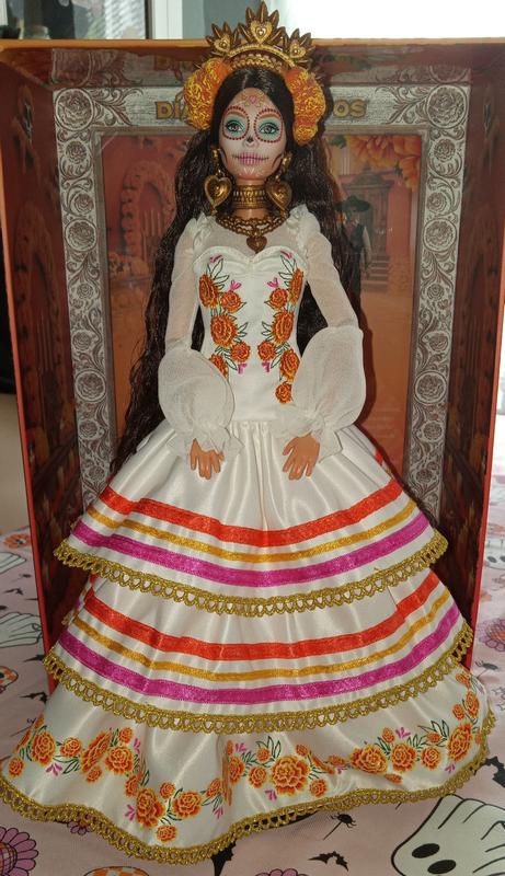 She is STUNNING!!! I absolutely love everything about this doll. Her face is beautiful, her dress is beautiful. She is a perfect 10. Finally a dress with different textures not just screenprinting of a design. There is different color ribbons and so much detail in the jewelry. Thank you Mattel for not putting tags through the top of her dress and ruining the fabric. The white dress with the pink, orange and yellow accents is a breath of fresh air. The shoe is a basic tan strappy heel with everything's else being so good the shoes are not even a factor. In my opinion best Dia De Muertos doll so far.