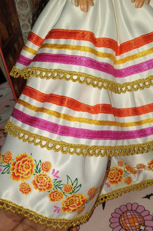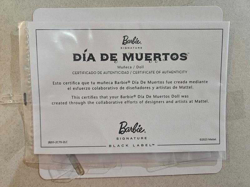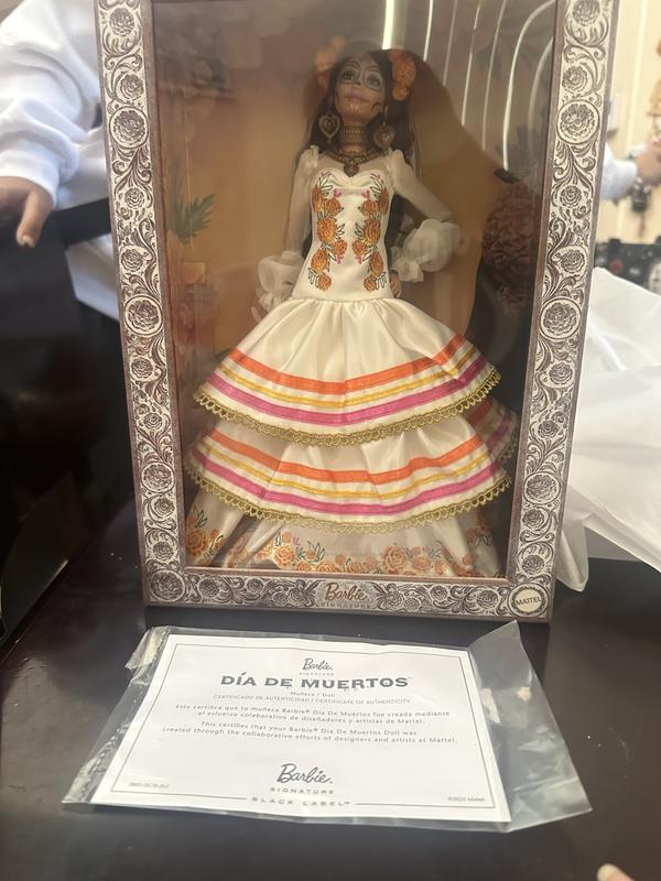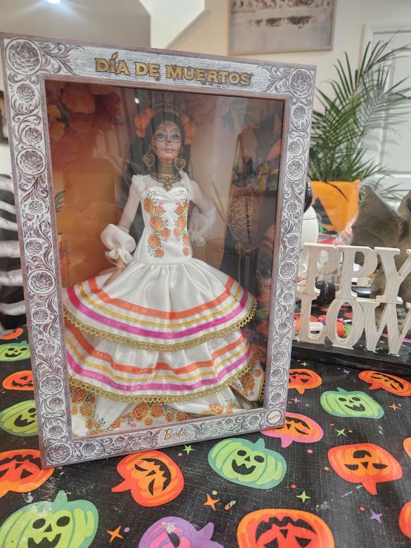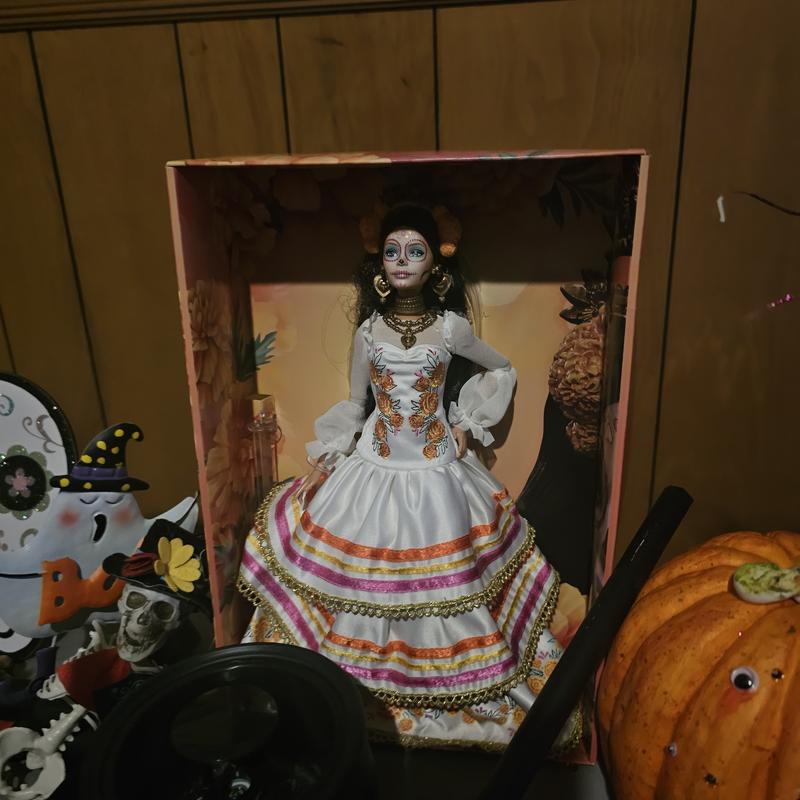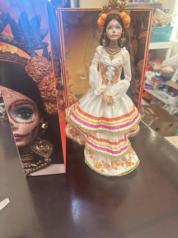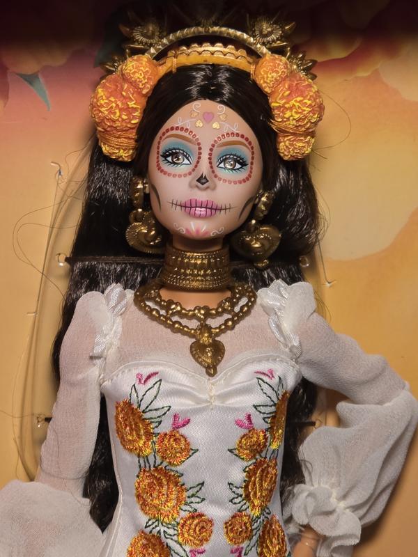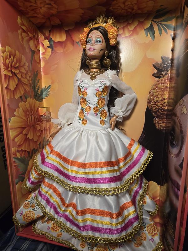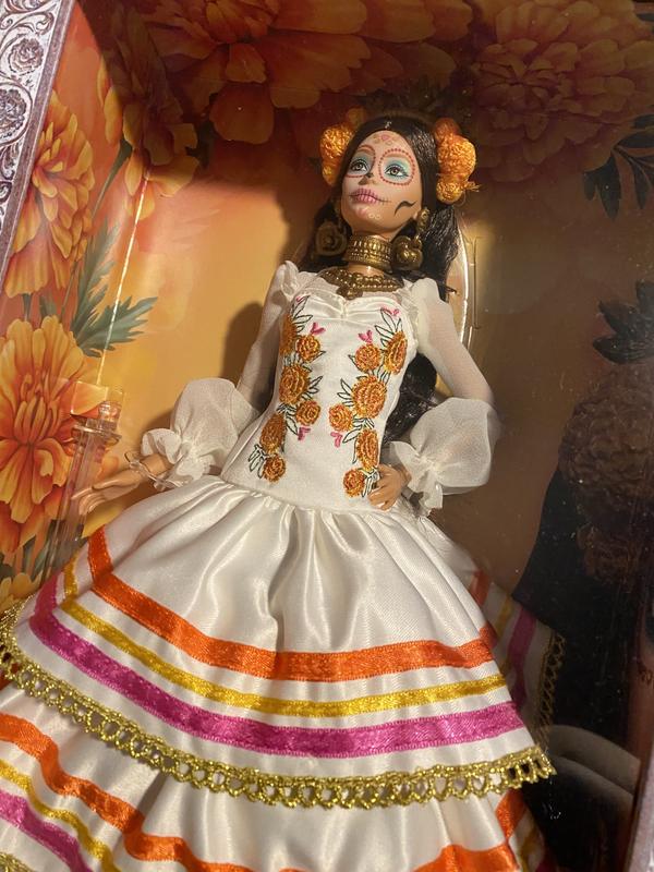 She is STUNNING!!! I absolutely love everything about this doll. Her face is beautiful, her dress is beautiful. She is a perfect 10. Finally a dress with different textures not just screenprinting of a design. There is different color ribbons and so much detail in the jewelry. Thank you Mattel for not putting tags through the top of her dress and ruining the fabric. The white dress with the pink, orange and yellow accents is a breath of fresh air. The shoe is a basic tan strappy heel with everything's else being so good the shoes are not even a factor. In my opinion best Dia De Muertos doll so far.