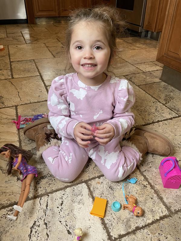 We really wanted this to build out our barbie house story! The dog bowl and dog food box are great to have in the kitchen. The travel doggy carrier is awesome to pair with the new barbie travel set that comes with the suitcase! The doll itself is so pretty with the butterfly dress to add to the closet!