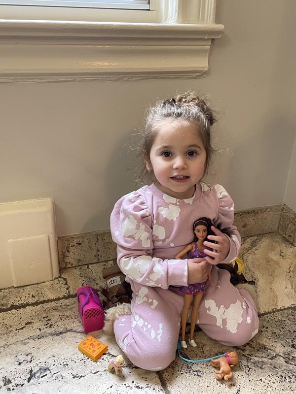 This is one of the cutest Barbie sets yet. I used it as a learning experience and my girls loved it and think that these pups are even more special. Watching them play with this Barbie and this styler warms my heart. They are so proud to show family their adoption certificate. The dogs are durable. The leash is very easy to attach. When you give them the bottle it indicates when you have to put them on their potty pad. Would highly recommend be if you child loves animals. The Barbie can kneel down to do all the clean up and everything.