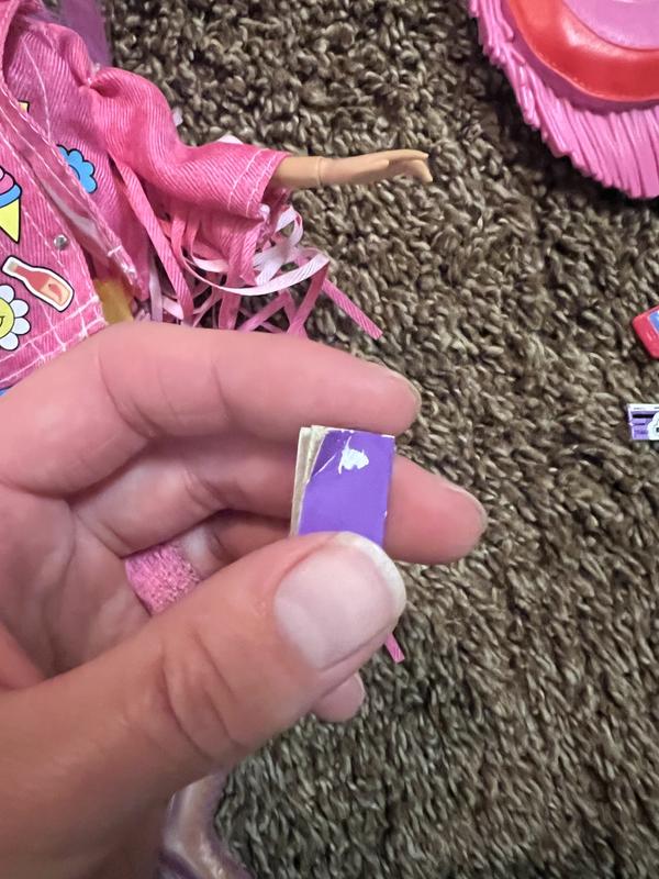 They probably couldn’t call her Coachella Barbie for legal reasons, but that’s what she looks like. She came with some other accessories (sunglasses, a little water bottle), but they were lost almost immediately out of the packaging. She is more articulated than a regular Barbie, so she bends at elbow, wrists and knees, and her feet are flat. The platform boots open in the back for easier play. Her outfit is cute, but the top is so small and flimsy it’s difficult to keep in place. Her hair band and earrings are attached, so that’s a plus.