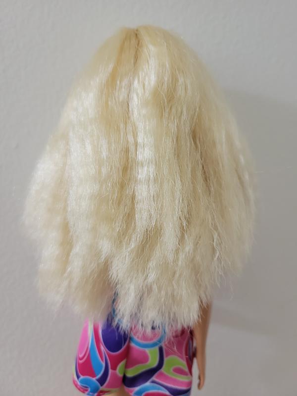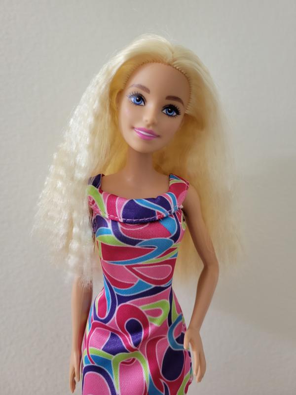 My daughter picked out this Barbie herself and was so excited to play with her. She loves her pink shoes and her “rainbow” dress. It does have a wonderful pattern! It also makes her look more dynamic by having one bent arm, and one straight. I thought her hair would have been longer being Totally Hair inspired. But it is a flattering cut and a more modern version of that Barbie. The doll is colorful and is a regular grab for my daughter when playing with her dolls. I am always annoyed with how they package these though with the plastic fastener in the back of their heads. I’m always afraid I’m going to cut their hair by mistake when taking them out of the packaging. I wish they would eliminate the fasteners in their heads. Also, this had a clear elastic around her shoulders that pressed her hair against her body as well, so she comes out the package with dented hair. I hope with time this will go away. Overall, she’s a cute vibrant doll that my daughter enjoys playing with!