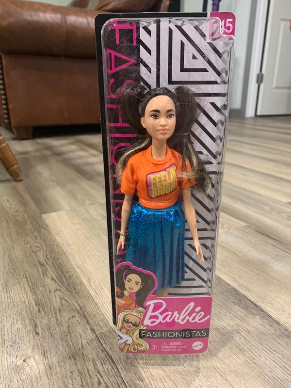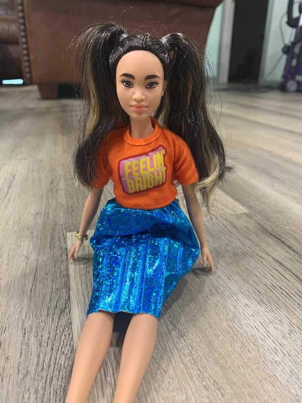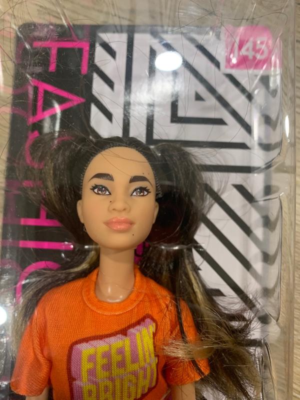 Received this Barbie #145 for my 8yr old daughter. She was attracted to the pigtails and colorful, shiny blue skirt. My daughter found the clothing easy to take on/off and she liked that there was a bracelet. As a Mom, I loved the highlights in the Barbie's hair and the diverse Barbie's in the Fashionista series. The only thing my daughter missed was having a hair brush come with the doll to brush her hair. Otherwise the Barbie was a hit and my daughter gave her a thumbs up!