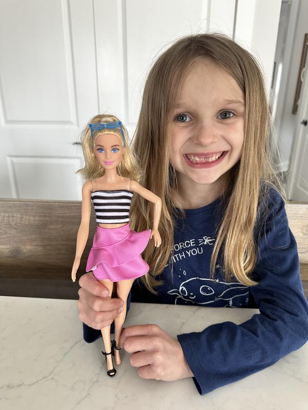 My daughter received this Barbie in exchange for an honest review. She immediately recognized that this doll was a modern recreation of the original Barbie, so the styling is spot on. Her critique, though, has to do with the articulation points. This Barbie is only articulated at the shoulders, hips, and head, so she has limited movements. My daughter also noted that the stiff arms make her hard to dress in new outfits. We will probably leave the hair/sunglasses as they are as long as they'll stay attached because they're cute and won't stay on well otherwise. I'm giving this Barbie 3 stars because, though she's cute, I probably wouldn't have bought her myself. Accessories wise, this doll comes with a pink skirt, black shoes, striped top with clear straps, and attached sunglasses. The outfit is the highlight for my daughter as it's already on another doll!
