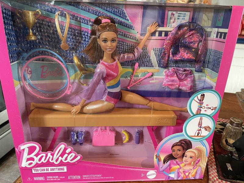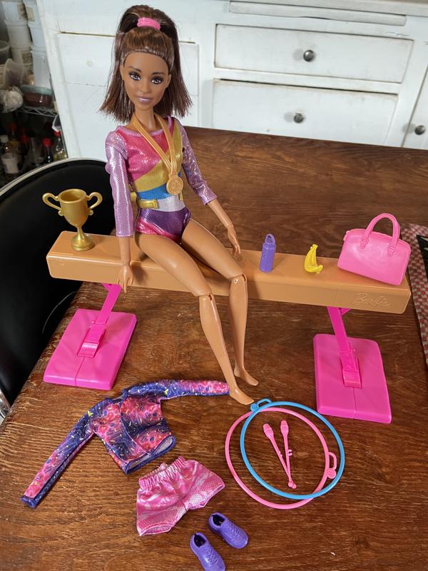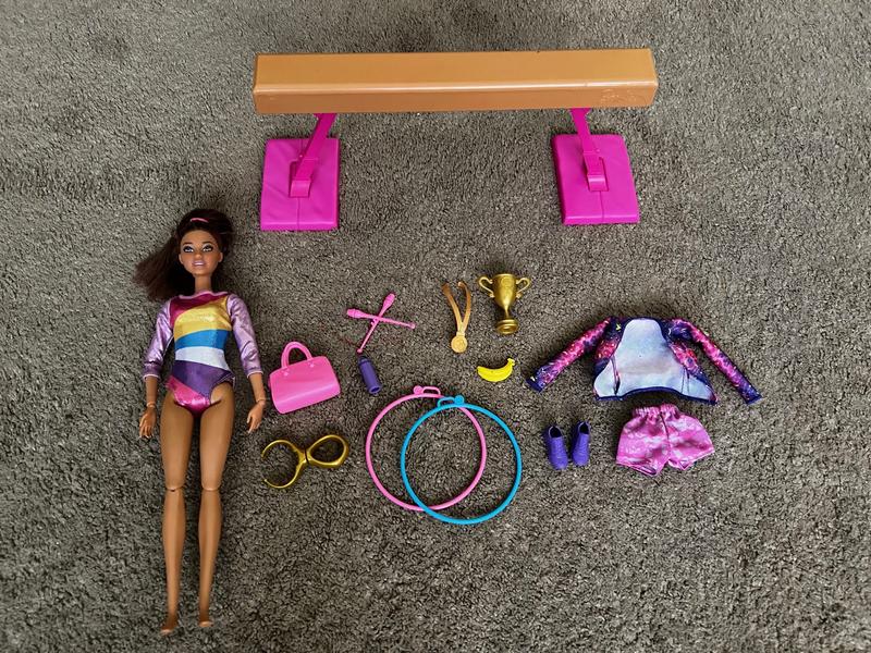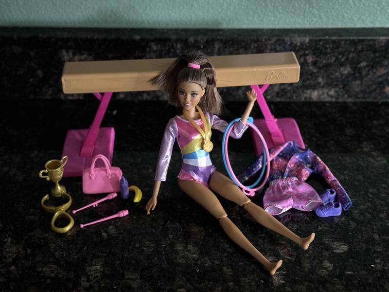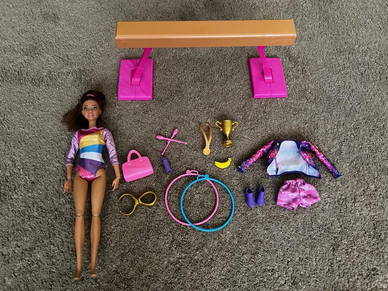 My daughter loves this Barbie. It has a ton of accessories including a trophy, medal, hula hoops, gym bag and much more. The Barbie can practice on the balance beam which is easy to set up. They only down side is all of the accessories are tiny and can be easily lost.