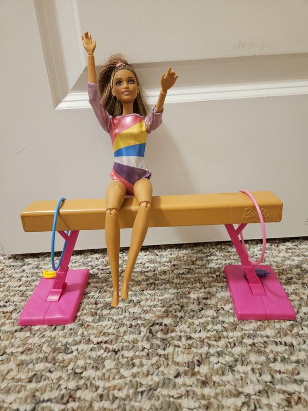 Gymnastics Play Set with Brunette Fashion Doll, Balance Beam, 10 Plus Accessories and Flip Feature
