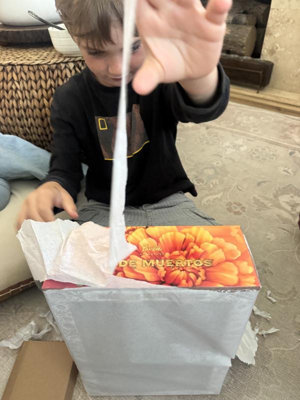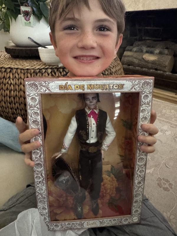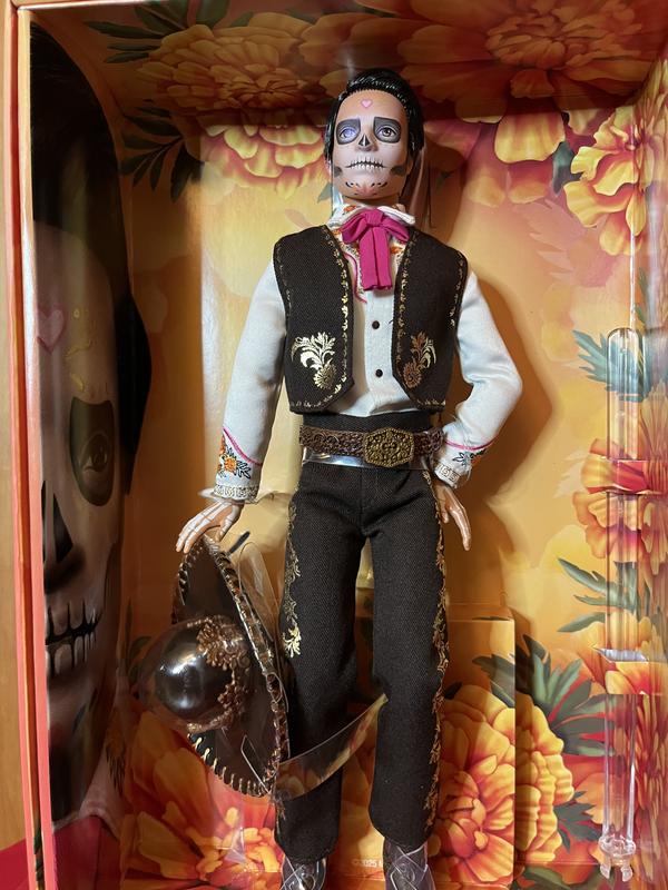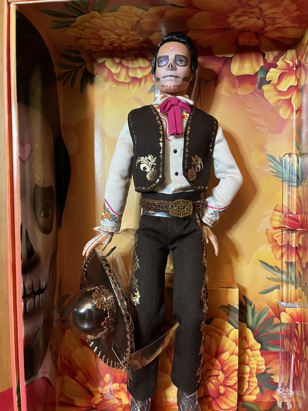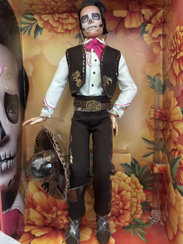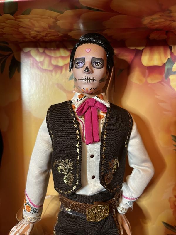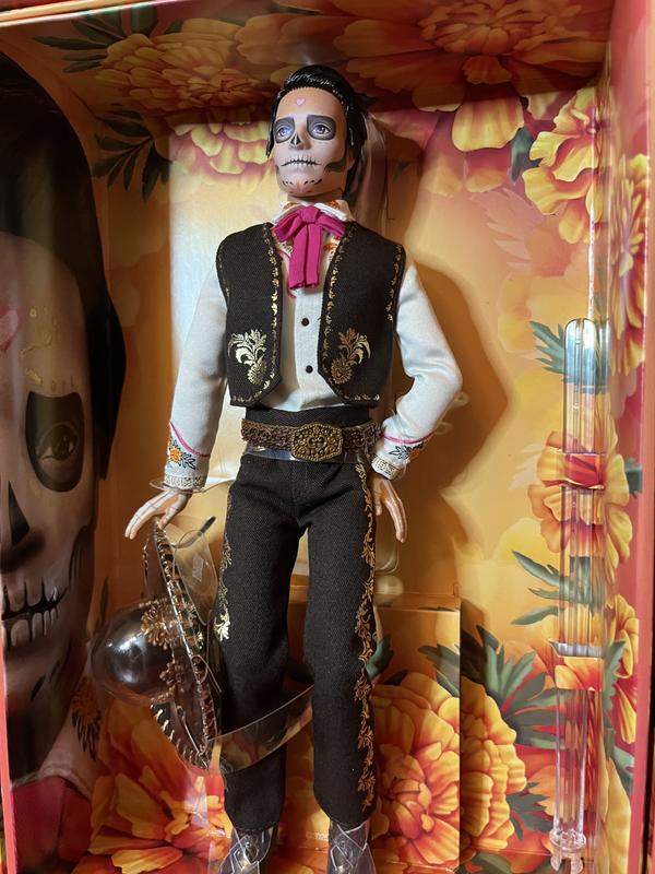 The box The art on the packaging is pretty, with flowers and a Ken photo. It's a variation from previous Dia de Muertos dolls. While it doesn't feel as artistic or collectible than previous years, the advantage is the front is open so you can see the doll. I do prefer previous versions as it felt like a piece of art. The inside box background print has marigolds; the flowers look very nice with the doll. The colors are our favorite combination so far, simple but traditional and festive. We like to collect in box. The way Ken is posed is a little strange, he appears too tall to fit in the box so he has his knees bent a bit. The doll The screening is gorgeous. The painted face is very nicely done. He has gold details on his face along with a heart and an orange detail. He is articulated so can be put in various poses. The quality of the doll feels very good and durable. His hair is rooted and slicked back, and his hands have bones painted on. The outfit has so much detail. The color scheme of white, orange, and brown is gorgeous. The shirt has delicate embroidered flowers under the vest. The vest, hat, and pants, have beautiful gold detail. It would have been nice to see the detail on the boots colored in the same way the hat is. He has a belt with skull details. The materials used are very good quality, the embroidery is real and not screen printed, and the belt, hat, and boots have raised details. The shirt even has very tiny, raised dots to look like buttons. This doll is a wonderful collector doll worth getting. The quality is good, the detail is thoughtful and well executed, and the design is interesting and unique from previous years which have seen a lot of black fabric. The more neutral colors mean it can be paired with several other barbies, one being the Kris Goyri collector barbie.