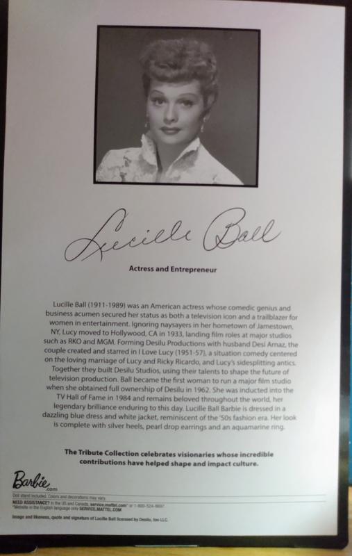 The doll does look like Lucille Ball and the bio it has for it is very informational about her career. It was a little hard for my daughter to get out of the box without tearing into it. Perhaps the details about Lucille Ball could be placed on a pamphlet that is included int the box instead of being printed on the box itself.
