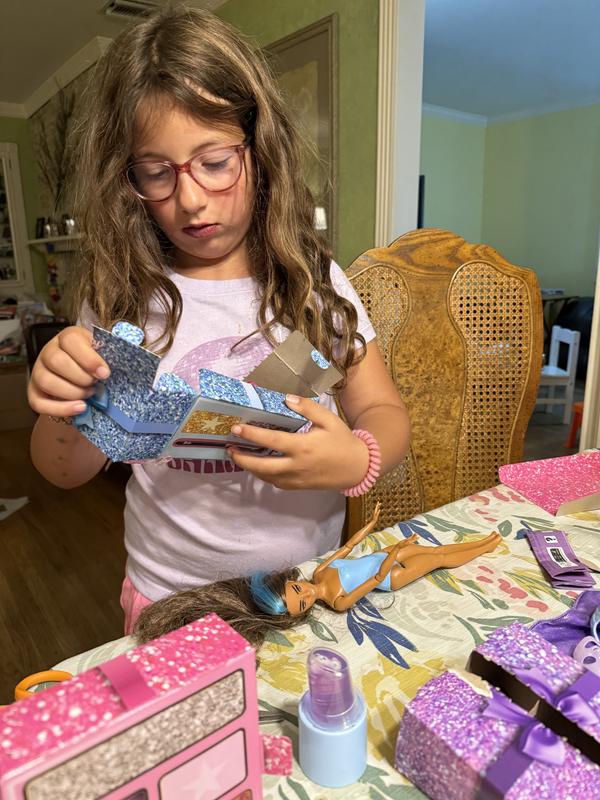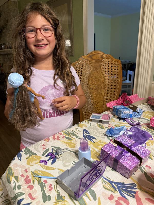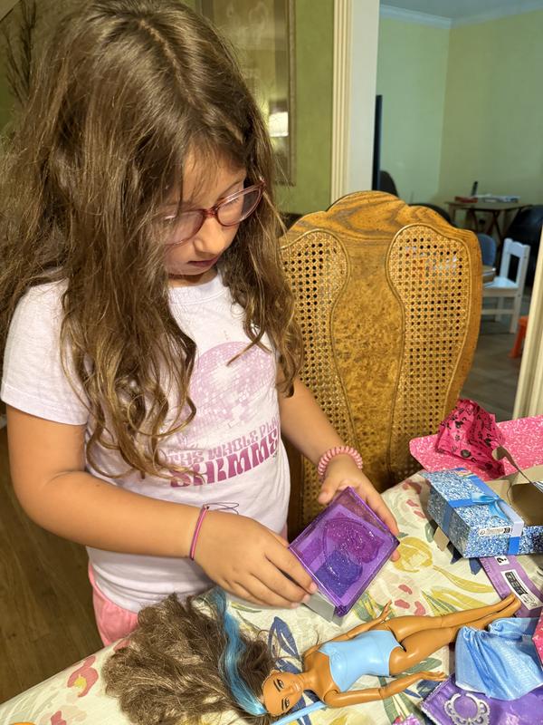 My daughter loves this Barbie! All of the accessories and boxes make this doll extra cute and fun! I think the fact that the dress is a towel on one side and a pretty party dress on the other is so cute! My daughter loves the hair color changing. Would definitely recommend