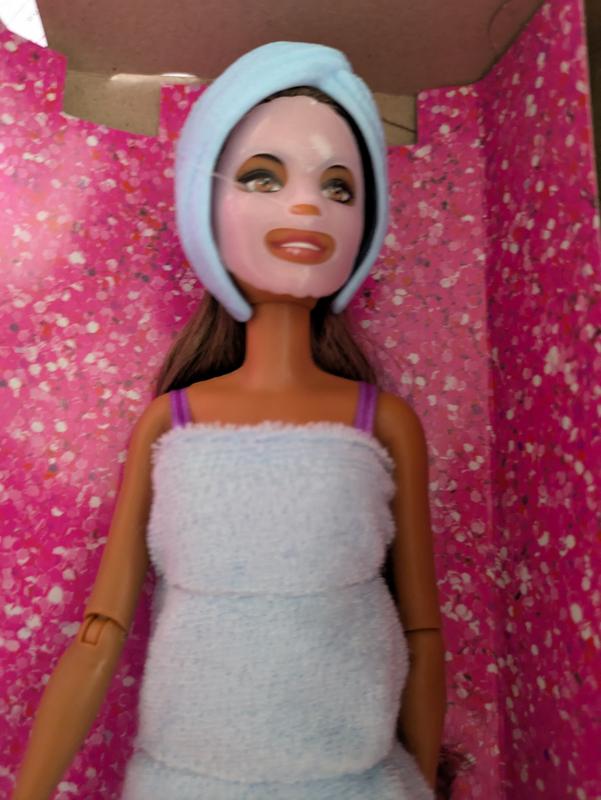 This Barbie is a fun unboxing toy/ gift. I think that my girls enjoyed opening the doll more than anything. There was a fun spa mask and robe. The toy comes with a little pet in a crumbly gel. My girls liked her color change hair in fun funky colors.