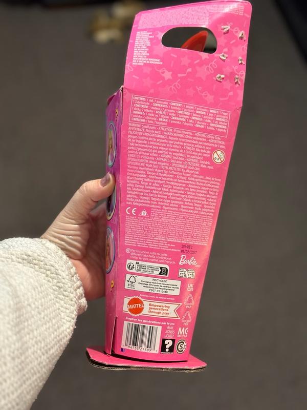 This is a fun Barbie packed full of surprises. She comes packaged in a colourful cup with pink bunny ears as a lid. Inside the lid is some slime which is very sticky. You have a straw to poke the lid open to reveal the slime. Inside the cup is a Barbie doll, x1 cup with slime, x1 straw, x1 scented pet, x1 pet bed, x1 skirt, x1 pair of shoes, x1 headband. We didn’t notice any scent on the squishy pet but that didn’t matter. The accessories are packaged in reusable ice cubes and mystery bags which is always a lot of fun. Unfortunately the cup couldn’t be used to drink from which is a shame. Barbies face has a colour changing surprise when you put water on it. We weren’t disappointed because the doll and accessories are fun to play with although I feel the cup should have been reusable and her hair should change colour which it doesn’t. The cup can store other things though.