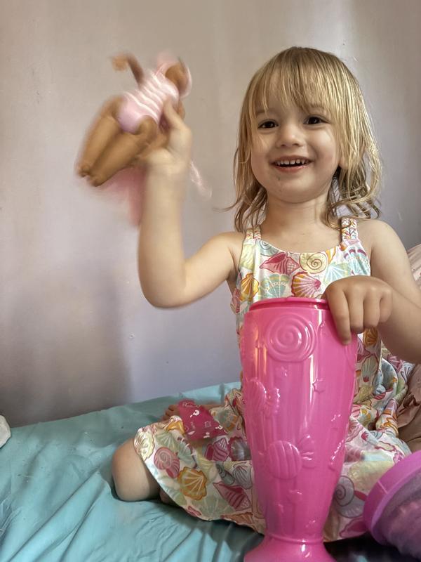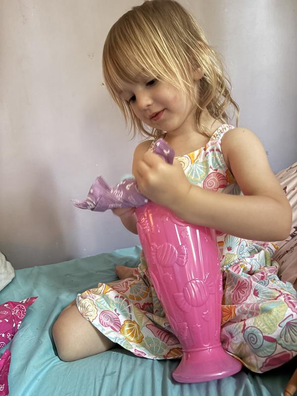 My daughter loves the pop reveal Barbie. The packaging is adorable- it’s an ice cream sundae cup. The only negative is that the sundae cup is not really an item she played with after opening it. It comes with a kinetic sand sensory dough in the lid. She didn’t love that, but some kids probably would. The instructions are unclear with the mini straw and that you have to puncture the foil to get to the sensory sand. It makes it overcomplicated. Everything inside is in surprise bags, including the doll. My daughter loves the surprise bags. The doll is beautiful. We received the doll with the pink hair, which she loved! The mystery bags contained a pet and accessories for Barbie. She very much enjoyed the experience of opening the mystery bags and dressing her doll. With some warm water, the doll has face decorations that appear. Overall the pop reveal doll is a great choice for any child. It’s better than buying just a regular Barbie doll. It gives the child multiple things to open and lots of excitement. As a parent, I like when my child takes a bit longer to open a gift and doesn’t just toss it aside. This doll does just that. She took her time and enjoyed all the extras that came with the doll. The only negative is the doll’s feet. She has very bendable ankles which makes it very hard for a little girl to put on clothes and shoes. The pop reveal doll is worth the money and good quality.