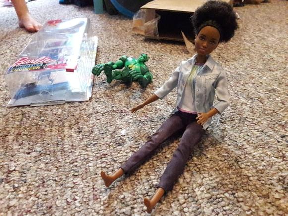 We received the black version of the Barbie Engineer Doll and my daughter is absolutely ecstatic with her. She is so happy to see herself represented in a science-based Barbie. She told me that this new Barbie is her favorite! This particular Barbie has natural hair and is dressed in pants, a shirt, and "denim" jacket. I'm not sure what kind of shoes she has because, as with all of Barbie's shoes, they were promptly loss. She comes with goggles, a laptop that opens and closes, and a robot that my daughter says can be programmed (via imagination) to clean her room. All in all, a Barbie win in our family.