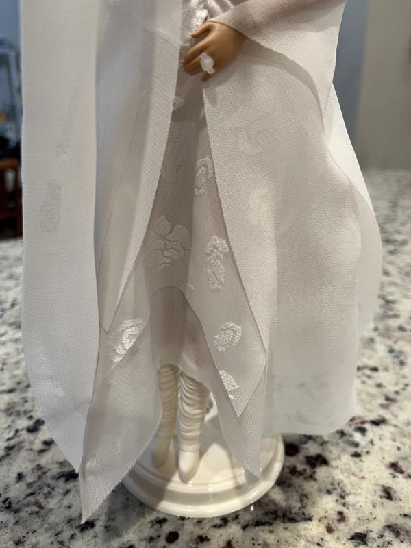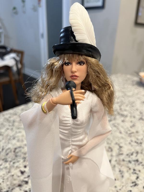 The Stevie Nicks belladonna doll is absolutely stunning ! There was a lot of detail that went into this doll , including her facial features . She really looks like Stevie ! I love how they captured the white floaty dress made out of a satin type material . It floats around the doll as you move her . The scrunch of the boots is really a fantastic detail that I loved a lot . The accessories are seriously cool. They are classic Stevie Nicks accessories. Her black top hat with a white feather in it, and the feather does move around a little bit, which is pretty fun . It also comes with a microphone that you can remove from her hand . The doll is well-made and sturdy for play . I let my daughter play with it and she enjoyed herself for hours .