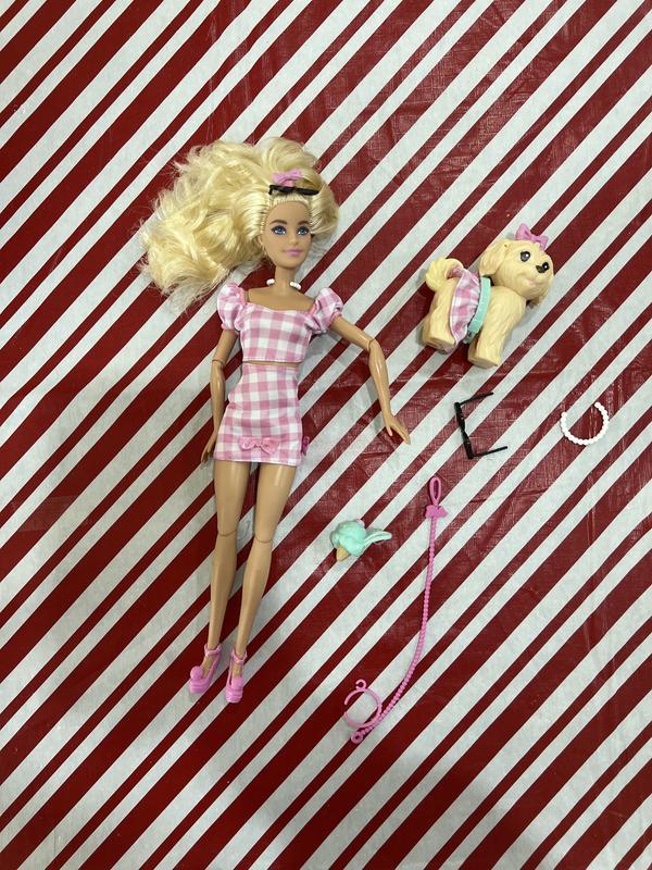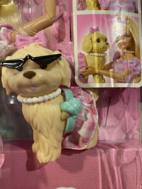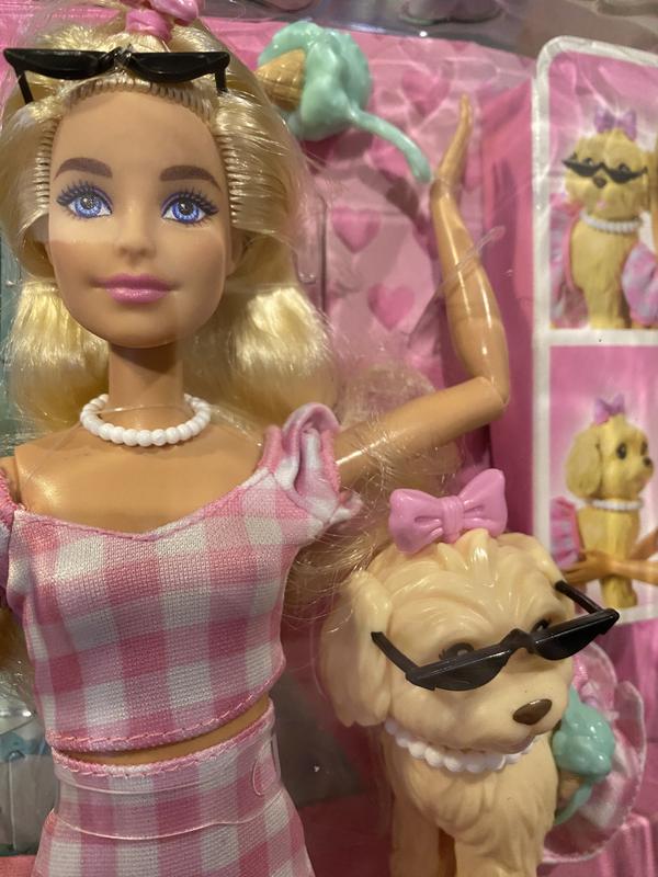 Super cute look between a girl and her pup! Barbie here is wearing a very cute pink gingham outfit that is reminiscent of the recent movie version of Barbie, including an updo with a matching bow. She has a cute little pup who also has a gingham outfit and sunglasses that match her human. This is a cute vibe that my daughter loved. There are four dolls in the series, each with their dog in a matching outfit and accessories. My daughter cna't wait to collect them all!