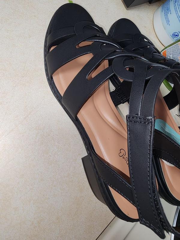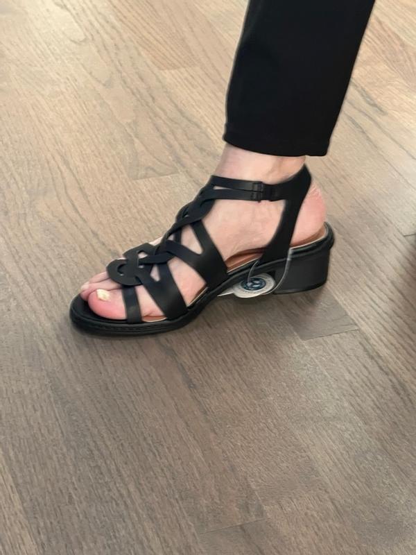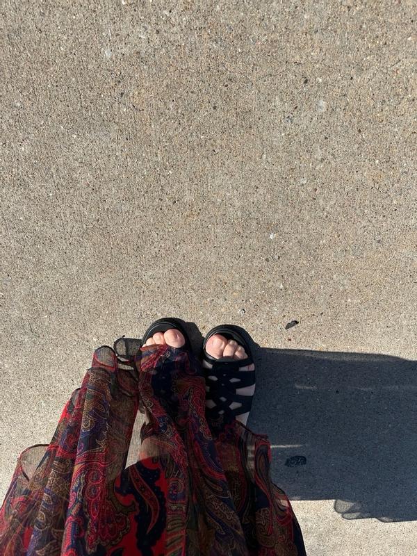 What a fun and comfortable summer sandal. I have a narrow-ish foot, so the shoe is slightly loose, yet the adjustable back strap helps with that. The block heel is great, feels so stable while walking, along with the cushioning sole. Buy these if you're looking at them!