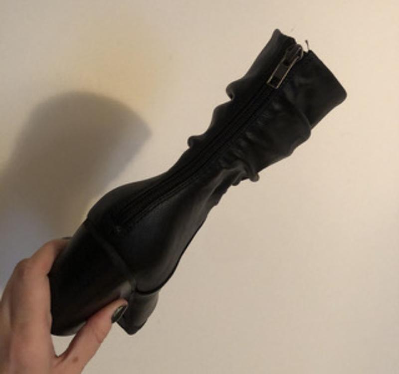 These are the cutest slender black ankle boots! They aren’t leather, but it’s a good faux leather and they don’t look cheap or plasticky. I rarely buy synthetics but these are great and I love the look. As for fit, I wear an 8.5 (or occasionally 9) in shoes, and I bought the size 9. I do have thin ankles and a somewhat narrow foot and these fits perfectly with a Smartwool sock, so I’d say these boots are true to size or may run a tiny bit small.
