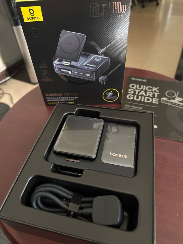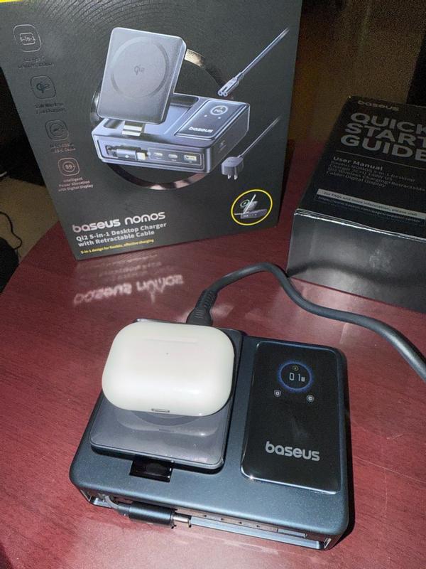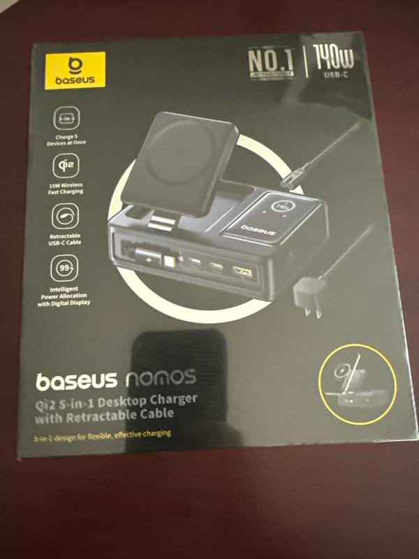 I recently picked up the Nomos 5-in-1 charging station from Baseus, and it’s been a game-changer for managing all my devices in one spot. The build quality is solid, with a nice, minimalist design that doesn’t take up much space on my desk or nightstand. The 15W magnetic wireless charger works flawlessly with my phone, snapping into place easily and charging without me having to fidget with alignment. The 100W retractable cable is a smart addition too — it’s perfect for fast-charging my laptop without having an extra cable cluttering up the area. I was pleasantly surprised by how smooth the retracting mechanism is. The other ports on the station are well-placed and versatile, letting me charge multiple devices at once without any noticeable drop in speed. It runs cool and quiet, even when everything’s plugged in. I also appreciate that it looks clean and modern — no weird LED light shows or bulky designs like some other multi-device chargers. Bottom line — if you’re after a reliable, sleek, and powerful all-in-one charging setup, this one from Baseus is a solid choice. It’s practical, well-built, and makes keeping your devices charged a whole lot easier.
