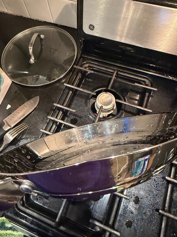 I really wanted to love this set. I just moved into a new apartment, and I needed a new set of pots really badly. I’m hyperconscious of the issues with nonstick coatings, so I would never use anything but stainless steel or cast-iron. that said, I can’t recommend these. They’re stainless steel, sure, but they’re so incredibly thin that the larger frying pan came with a big dent. I would say, “OK, yeah, they’re thin, but that just means they’re super light!” except there were a bunch of other problems. The biggest issue is with the frying pans. Although they’re both reasonable sizes from lip to lip, the amount of flat bottom is actually super small. It’s a tiny circle of flat, and then a big curve up to the lip. (I added pictures to show what I mean). That means you have barely any surface area to try to get a sear on a piece of meat of any size. I can’t imagine a piece of steak that would fit in this. Is there potentially some use for a pan this shape? yeah, probably. But this bills itself as a “basic essentials” set, and a basic essential is a frying pan with a flat bottom that you can actually fry things in. Another issue is with another part that I was super excited by and really wanted to love, which was the strainer lid. I attached it correctly, and tried to strain my pasta through it, and at first it seemed to work, although it was slow, but then of course the lid just popped right out and off and half of my pasta ended up in the sink. So, totally useless.