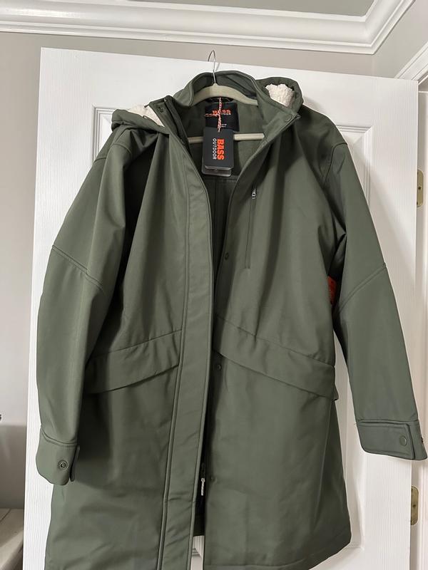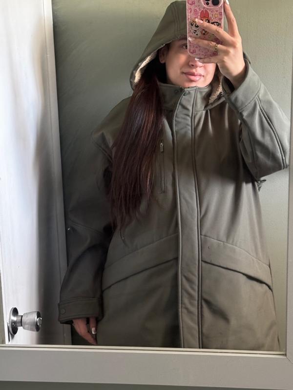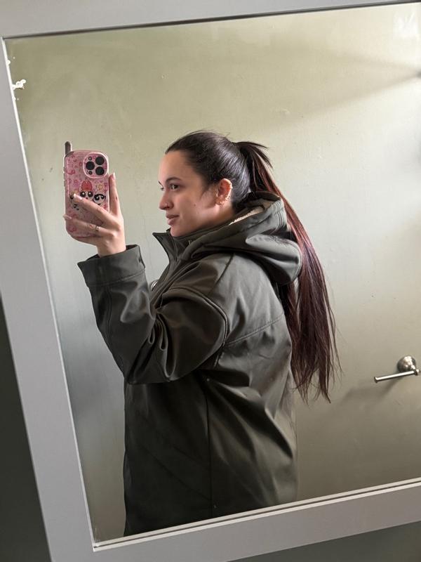 purchased Small, oversize fit, perfect for weather in NYC Spring time, wish zippered pockets on the side to secure wallets, keys.