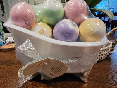 Cute gift. Multicolored bath balls in a plastic bathtub but not very fragrant nor does it have any obvious skin softening effects.