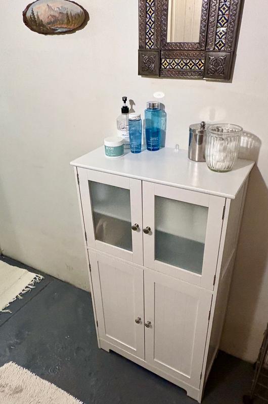 This cabinet is cute and roomier than expected. It took my husband and I about 2-1/2 hours to put it together (me organizing and handing him stuff, he screwing it together), but the good news is - all of the pieces are there and the hardware and cabinet pieces are well organized and numbered so it went as smoothly as it possibly could. It has an anchor at the top for stabilization but we found we didn't need it. It's well made for the material and looks good in my extra bathroom. It holds so much stuff! Several rolls of tp, makeup, medicinal things are all hidden behind the glass - and the bottom shelves hold all my cleaning products with room for additional things. Very impressed with it. I got it on sale but at regular price it would be a good value for the $.