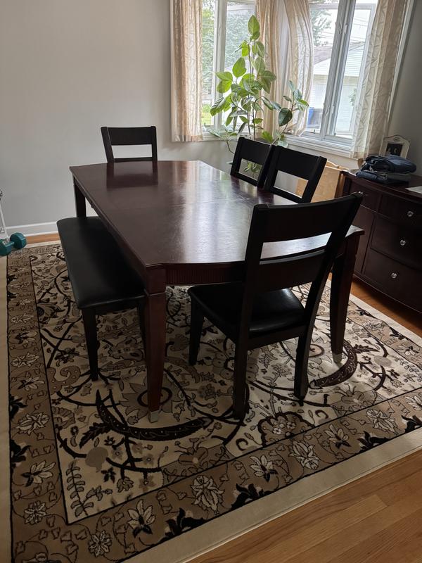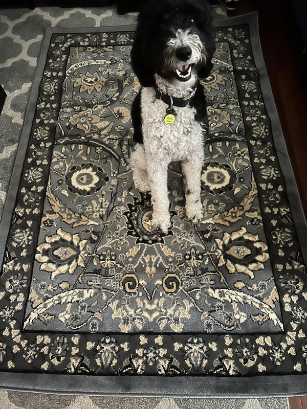 This rug is beautiful. The dark grey with black, cream and tan color gives the right amount of color and warmth.
