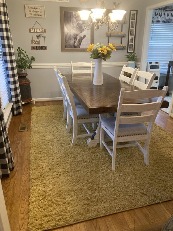 Pros - the rug is soft and woven into cotton on the bottom which is nice. The color is exactly what I was looking for and as pictured. Shipping was fast and no damage to the rug or box. Cons - The rug is really thin. I expected more cushion to it being shag. The shag itself is sparse. The bottom woven area is really dark and because the shag is sparse, it is visible through the shag. This is unfortunate because the rug is cream and the binding bottom is very dark. It makes it look like there are black spots throughout the rug. This is disappointing because it makes the rug look dirty or like it has black holes all over it. Overall, I would not recommend this rug in a light color because of this.