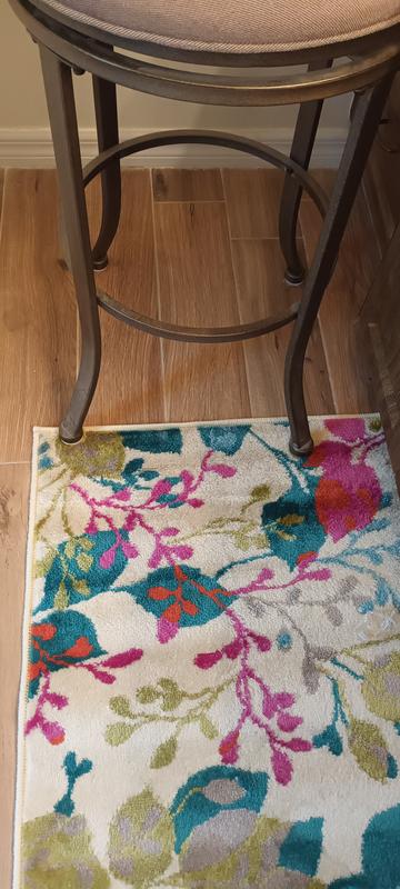 This rug is bright and colorful and adds a spot of cheer to my dining area! It was a little stiff when it arrived but is starting to flatten out. The colors are bright and beautiful!