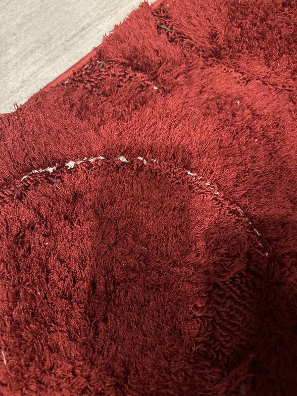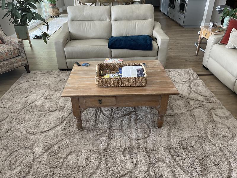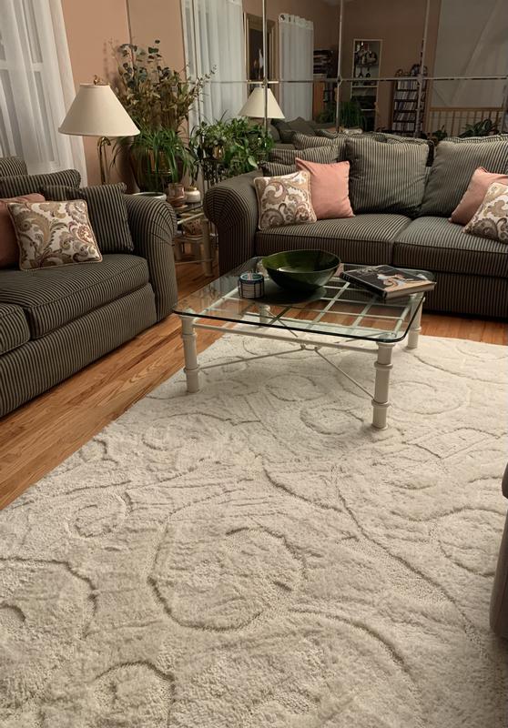 This rug doesn't look like the pictures. I can barely see the swirl design. It is also very thin. I ordered it 7 months ago, and kept it wrapped up until my house was ready. I wished I had opened it and spread it out then, because I would have sent it back. That was my mistake. It is very soft and feels good barefoot I just expected it to be more plush, and the design to be noticeable.