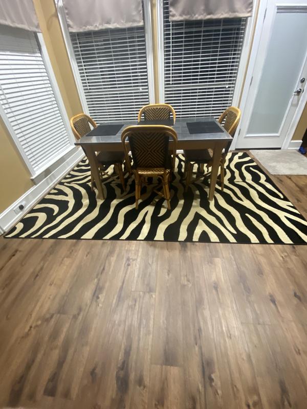 Rug looks beautiful. My only disappointment was I wish it was a little bit thicker but I still love it. This rug replaced the leopard print rug that I also loved but had too many stains.