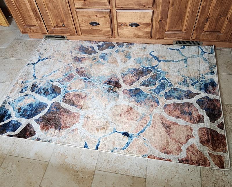 What a fun rug. I put it by the patio door. Pool outside so I liked the water/sand vibe.